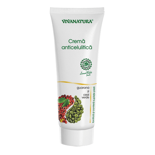Crema anticelulitică VivaNatura cu guarana și ceai verde, conține un complex de 98% substanțe naturale cu rol puternic de ardere a grăsimilor, pielea devine netedă și fermă, capătă contur și elimină depunerile inestetice cu aspect de valuri. Primele rezultate apar după cca. 21 de zile. Pentru obținerea efectelor maxime, aplicarea se va realiza timp de 60 de zile.
