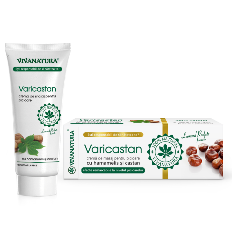 Laboratoarele Genna – VivaNatura au creat un produs 100% natural, Varicastan, o cremă pentru masajul picioarelor cu circulație periferică deficitară și varice, cu hamamelis și castan, care îmbină principiile active din plantele într-o formulă ideală pentru confortul și sănătatea picioarelor tale.